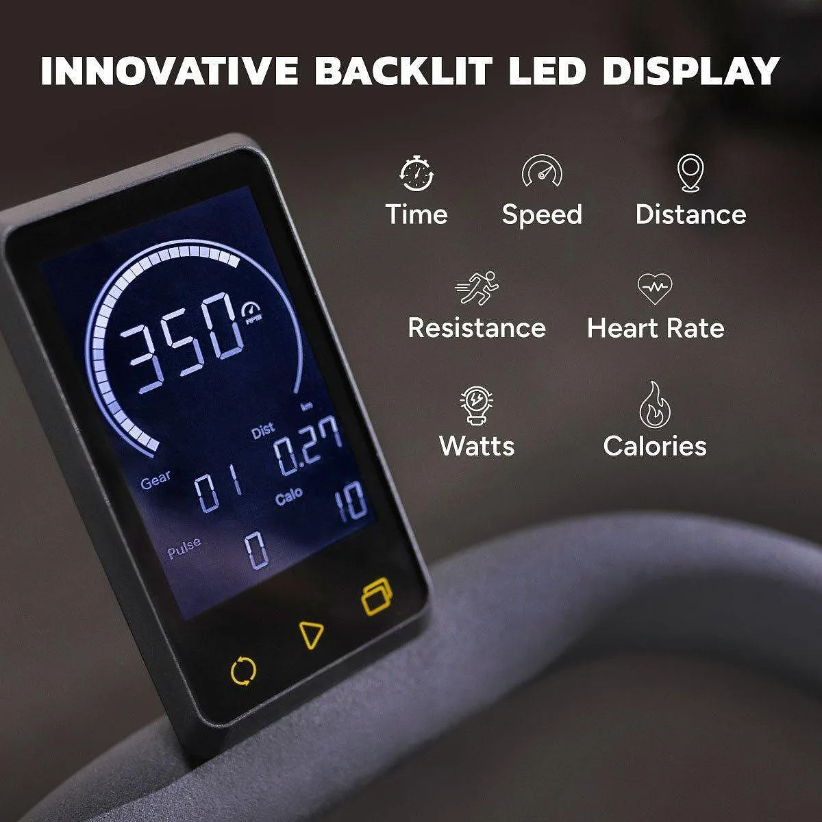 LCD дисплей – показва време, дистанция, скорост, калории и други ключови параметри на тренировката.