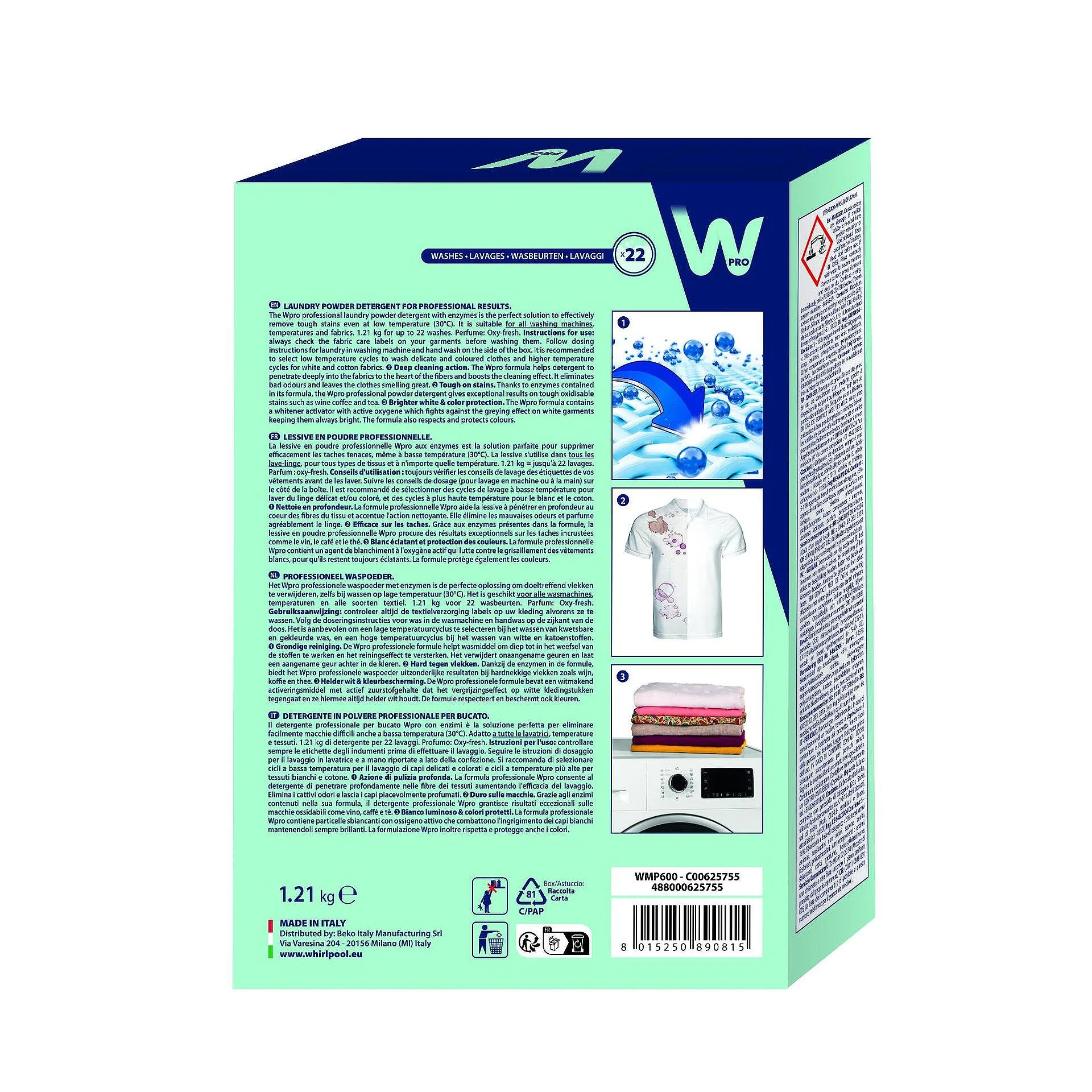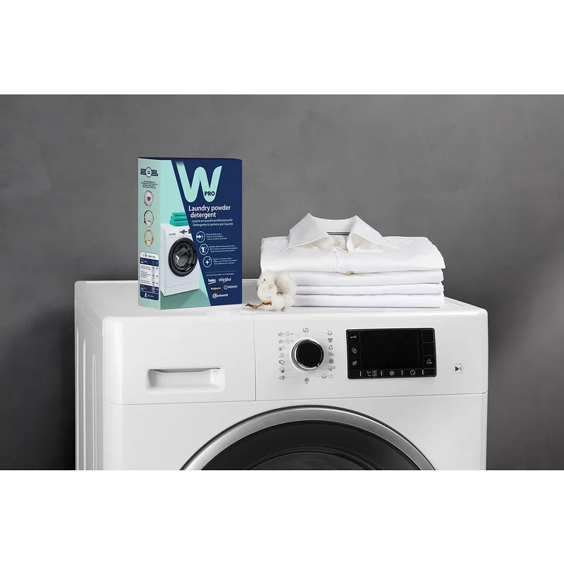 Комплектът включва оригинален Wpro прах за пране, специално разработен за уреди Whirlpool.