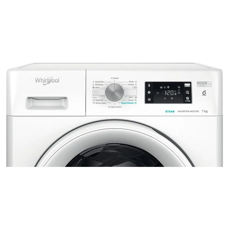 Whirlpool предлага богат избор от програми за различни видове тъкани – памук, синтетика, деликатни, спортни дрехи и бързо пране.
