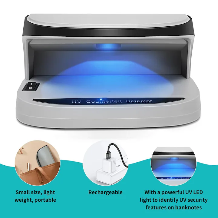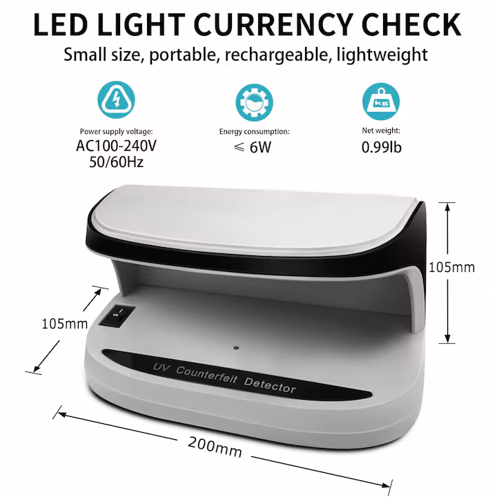 Преносимият UV/LED детектор Axroad Mall предлага надеждна и бърза проверка на банкноти и документи, комбинирайки мощна UV светлина и ярка LED подсветка за максимална точност. Лек, компактен и изработен от устойчив ABS материал, той е идеален за мобилна употреба, благодарение и на възможността да работи с батерии. Универсалната му съвместимост с валути от целия свят, както и способността да проверява паспорти, лични карти и кредитни карти, го превръщат в практичен инструмент за магазини, офиси, хотели и мобилни касови точки. Уредът осигурява надеждна защита срещу фалшификати, където и да се използва.