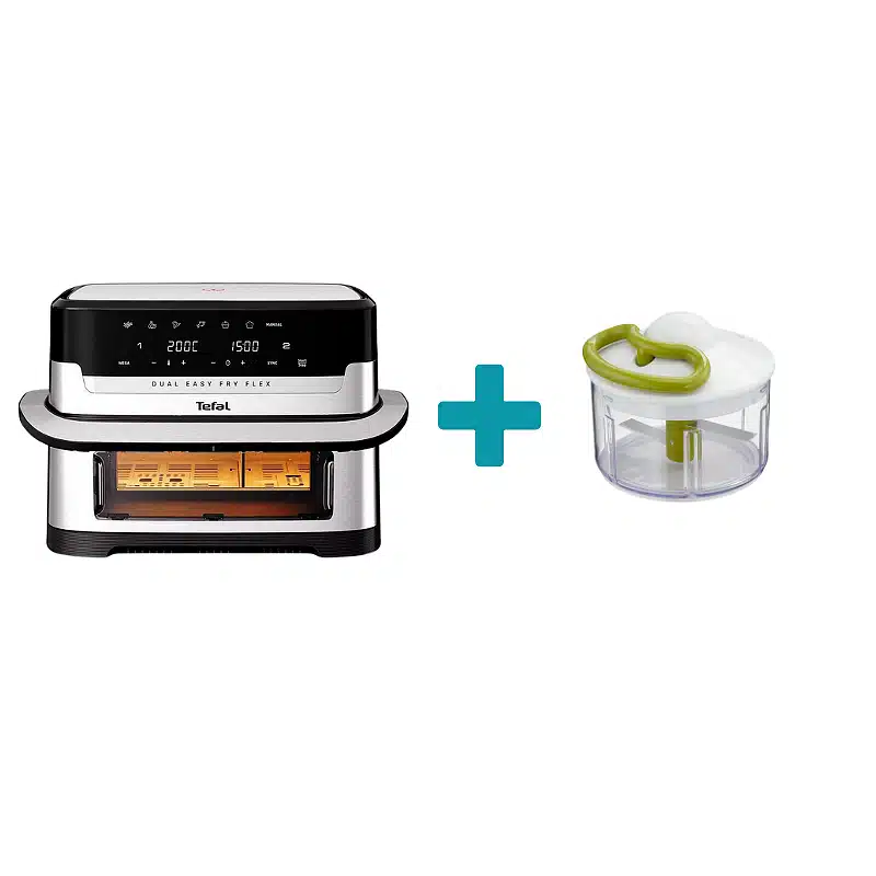 Tefal EY922DE0 Dual Easy Fry Flex е модерно, практично и гъвкаво решение за здравословно готвене у дома. Двете зони дават свобода да комбинираш различни рецепти, Flex режимът осигурява простор за по-големи порции, а Sync функцията помага всичко да е готово навреме. Добави към това високата мощност, широкия температурен диапазон, удобното сензорно управление и възможността да наблюдаваш храната през прозореца – и получаваш уред, който реално улеснява ежедневието. Ако търсиш air fryer, който да спести време и да даде повече контрол върху резултата, този модел е отличен избор.